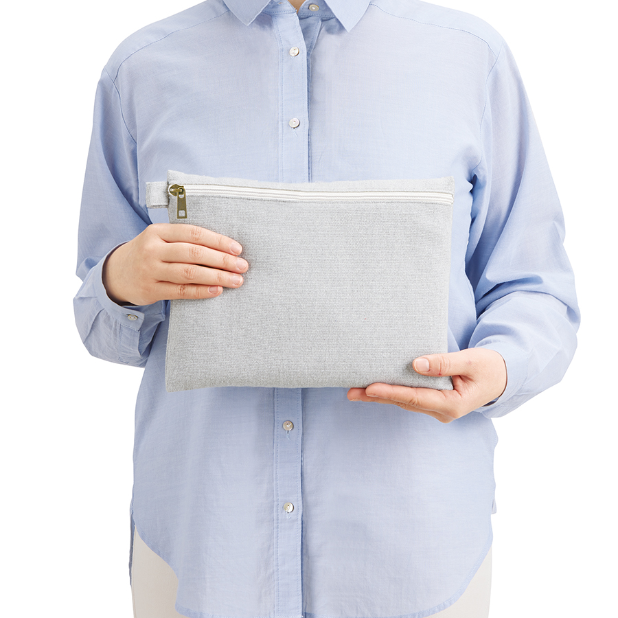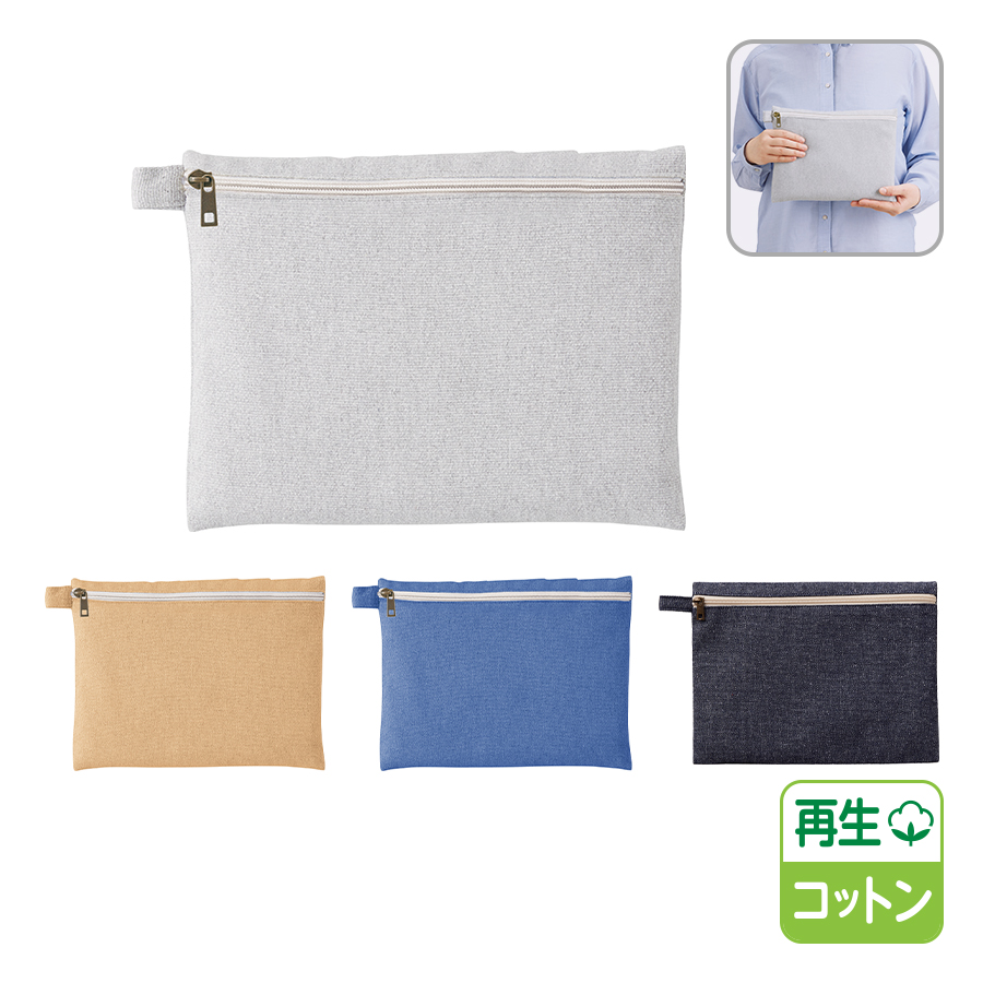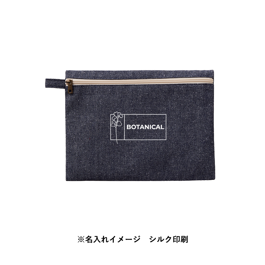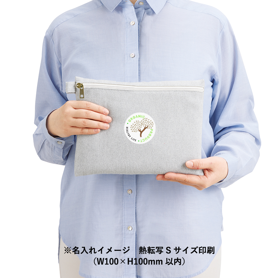 再生素材を使用した、普段使いしやすいフラット形状タイプのポーチです。フラット面にファスナーがついている為、カラビナやボールチェーン等につなげて持ち運ぶことができます。大きめの手鏡や細々としたコスメなど化粧ポーチとしてもぴったりのアイテムです。単色印刷からフルカラー印刷まで対応。お好きなデザインでオリジナルグッズをおつくり頂けます。アパレルの購入品特典やオープンキャンパスのノベルティなどおすすめの商品です。
